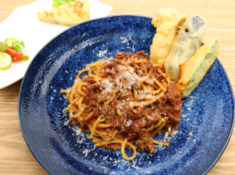 1月新メニュー! お肉をたっぷり使った旨味の詰まったミートソースにサクサクに揚げた野菜のフリットを添えました。 (じゃがいものキッシュ・カプレーゼ付)