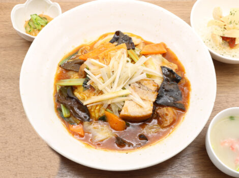 自家製チャーシューの厚切りを使用した中華丼と【中華くらげ】【鯖の唐揚げ】【カニ入り白湯スープ】の贅沢な中華御膳です。