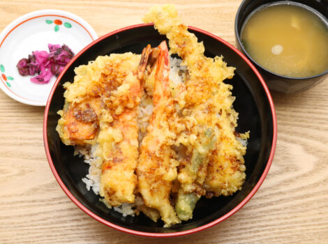 海老2本と穴子が1本乗った贅沢な天丼です。特製のたれをお好みでかけてお召し上がりください。 (味噌汁・漬物付)