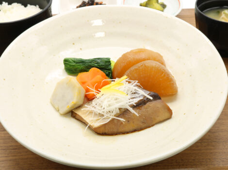 1月新メニュー! 2025年度入社 及川拓海考案メニュー! 定番のぶり大根ですが仕上げにたれを煮つめることで旨味を閉じ込めました。 (小鉢・御飯・味噌汁付)
